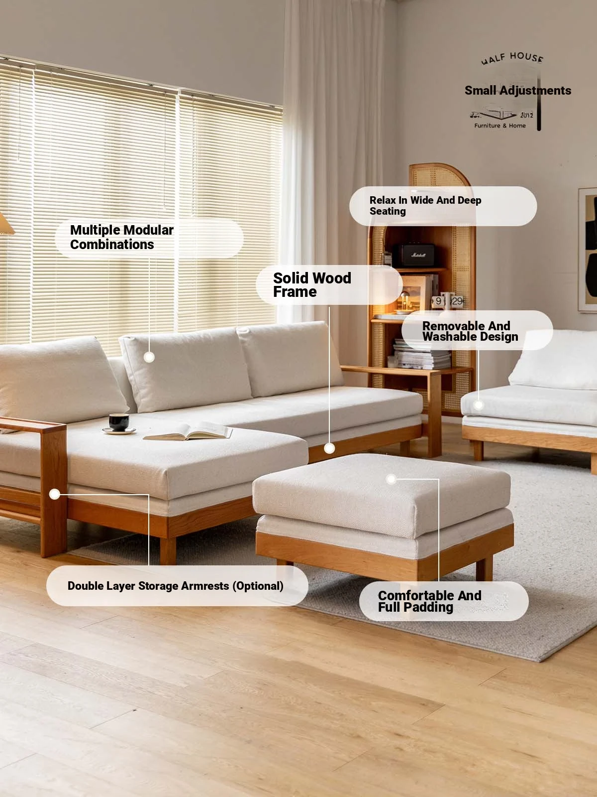 Nordic Style White Oak Sofa - Washable and Modular Three-Seater Furniture for Modern Living