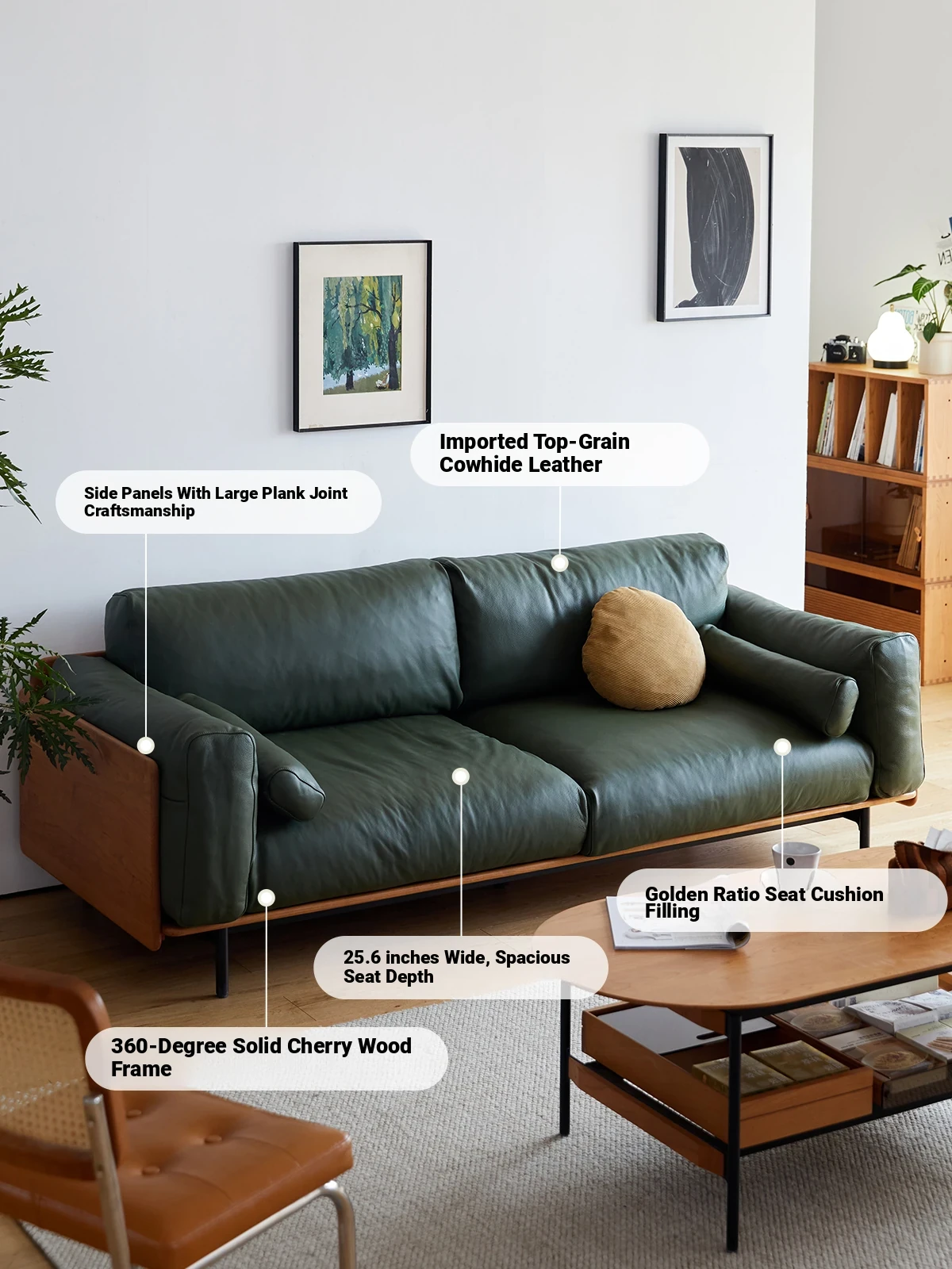 Cherry Wood Modern Scandinavian-Japanese Leather Sofa – Premium Genuine Leather Couch for Cozy Living Rooms, Compact Design, Elegant Solid Wood Frame