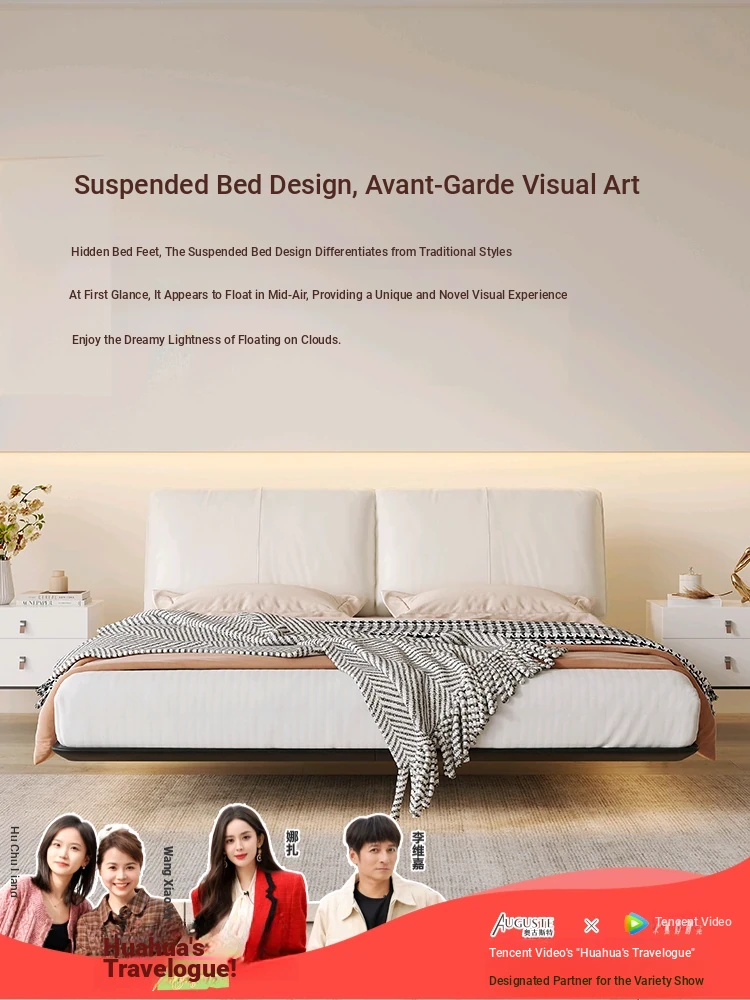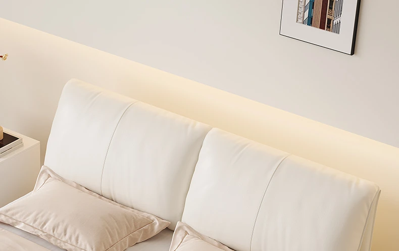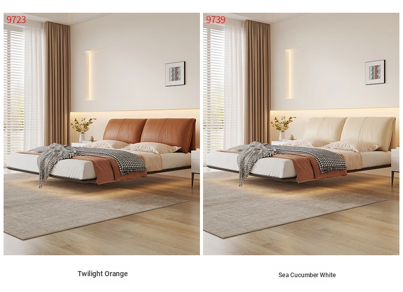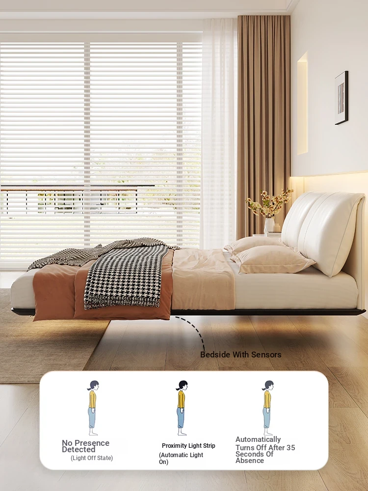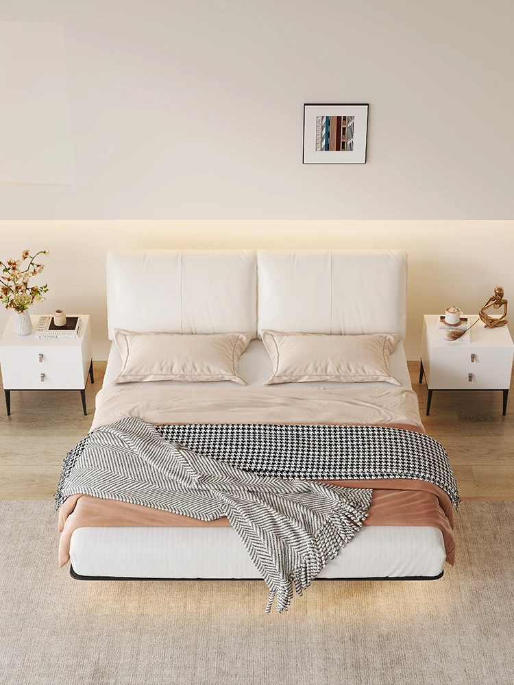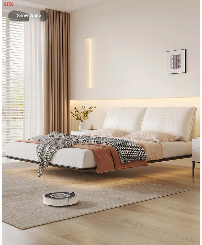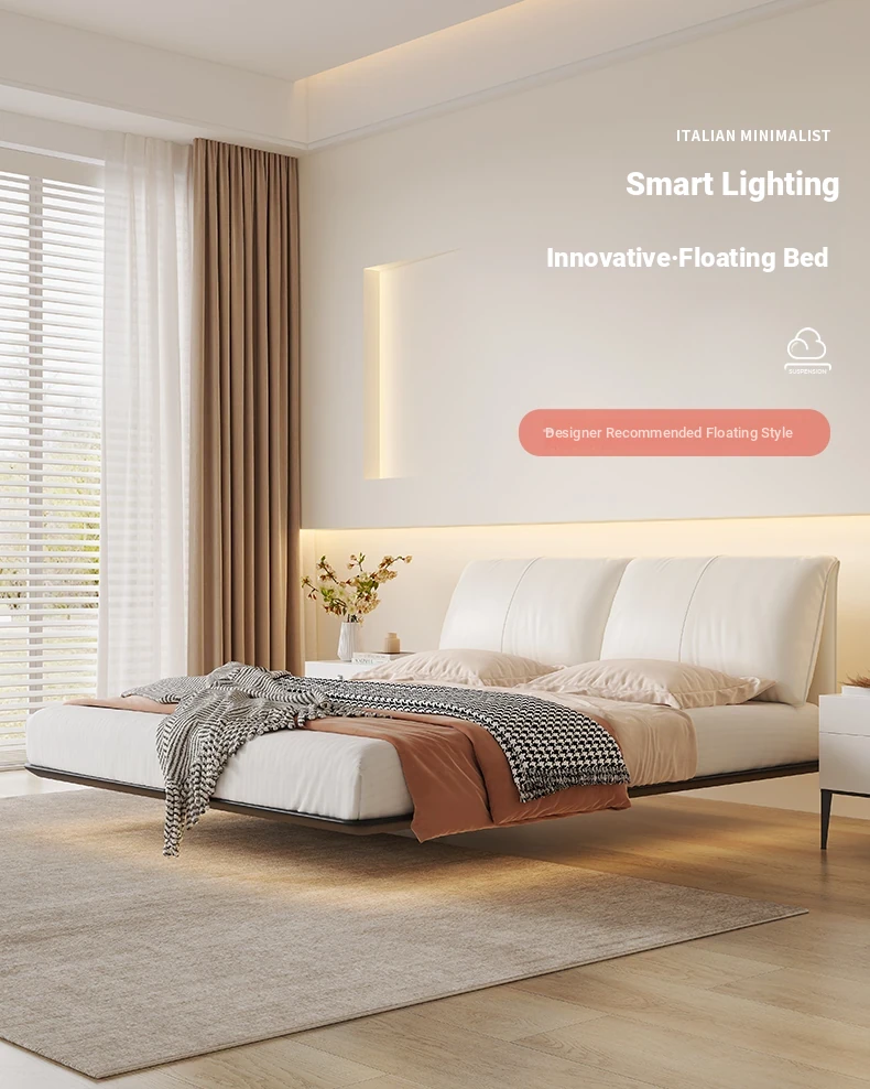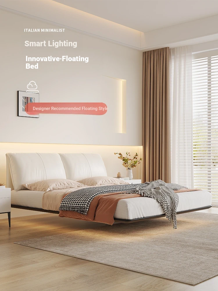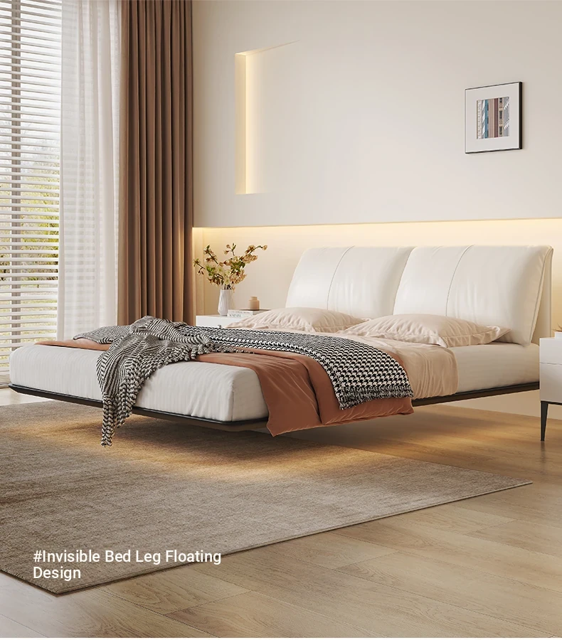 Elegant Italian Minimalist Genuine Leather Floating Bed – Modern 1.8m Soft Cream Upholstered Double Bed for Stylish Bedrooms