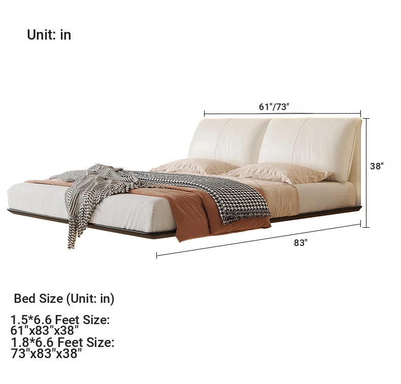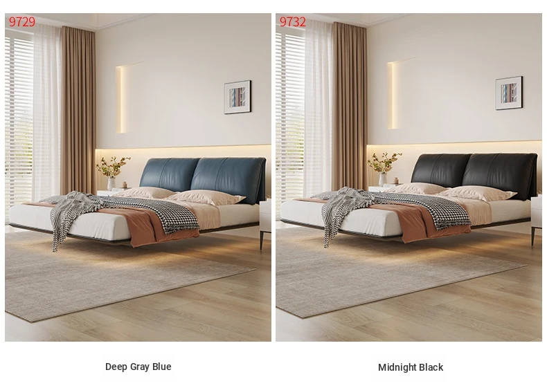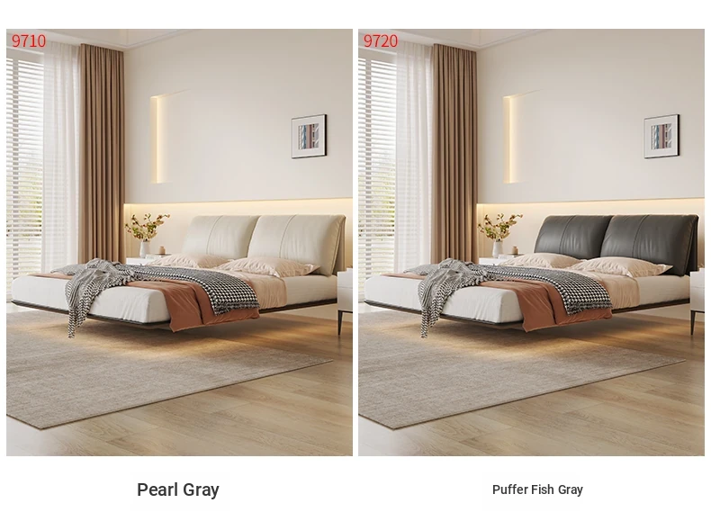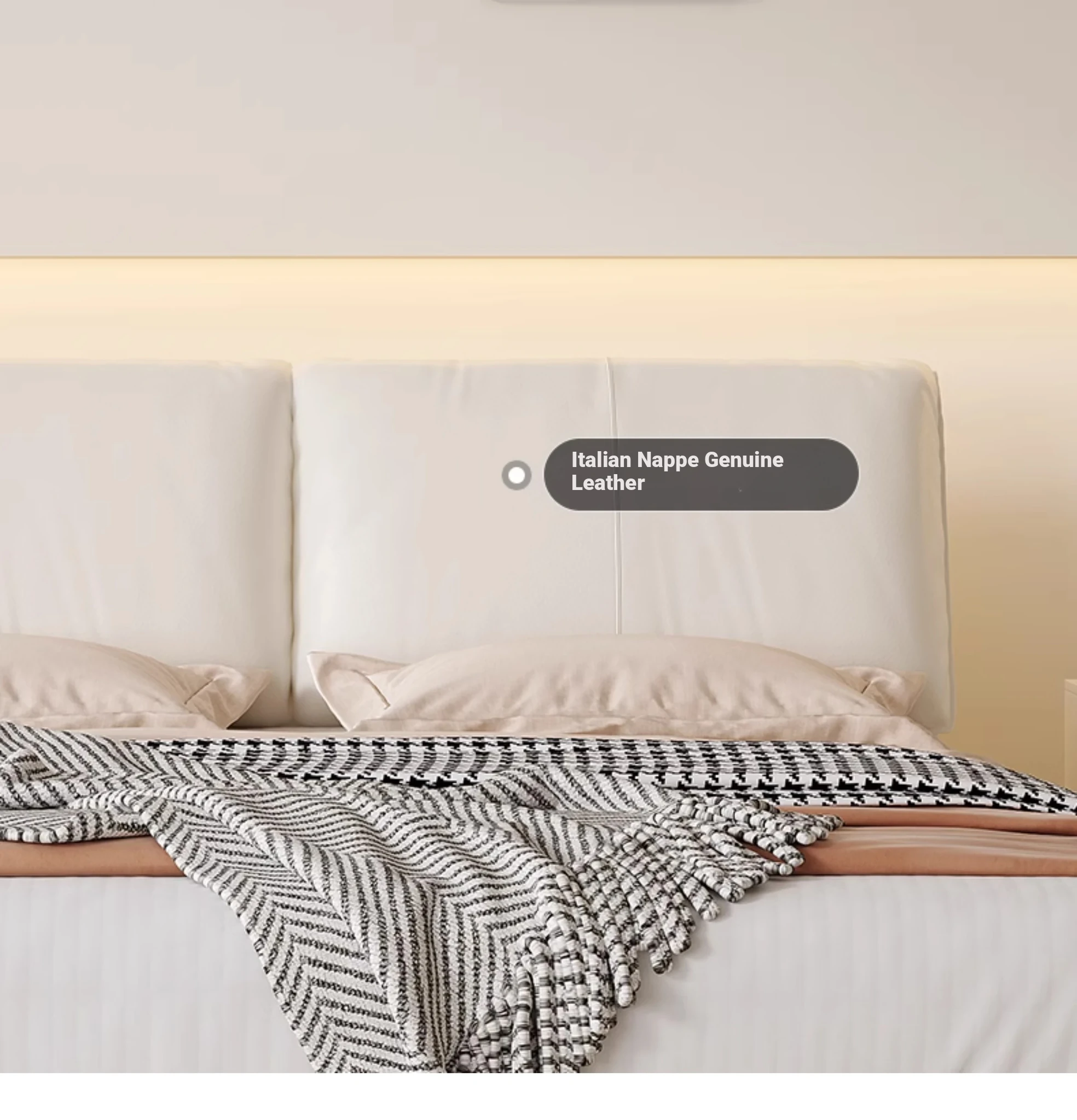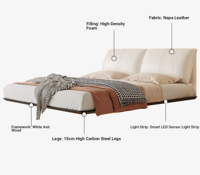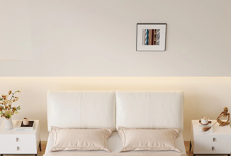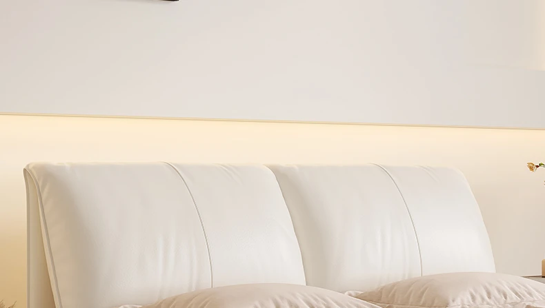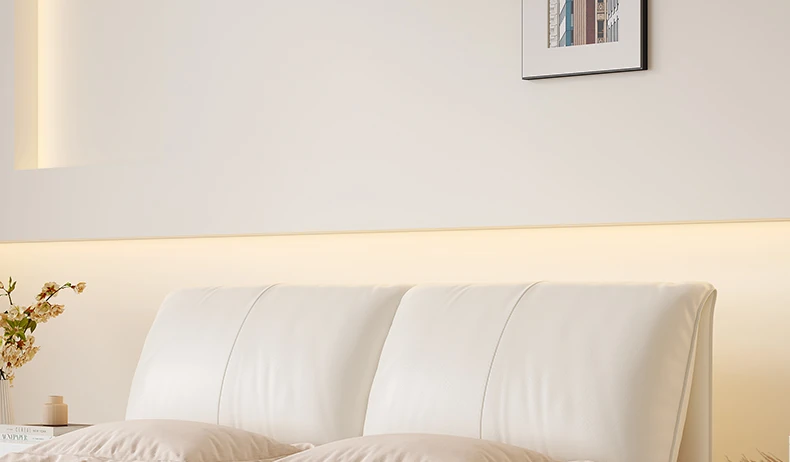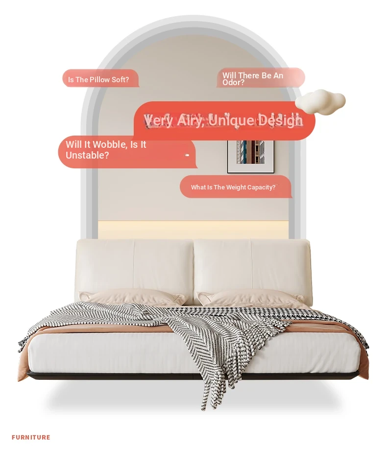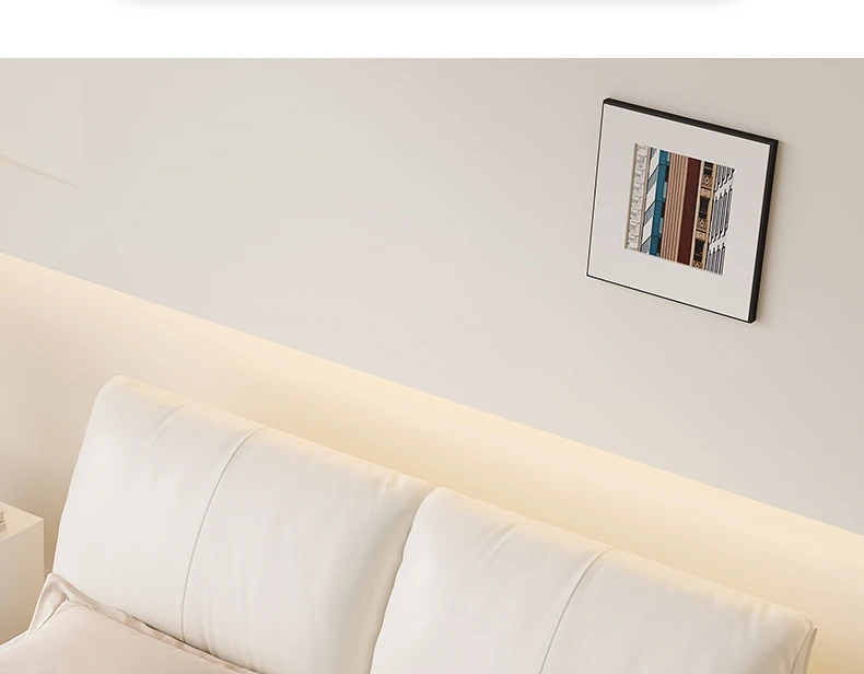 Elegant Italian Minimalist Genuine Leather Floating Bed – Modern 1.8m Soft Cream Upholstered Double Bed for Stylish Bedrooms