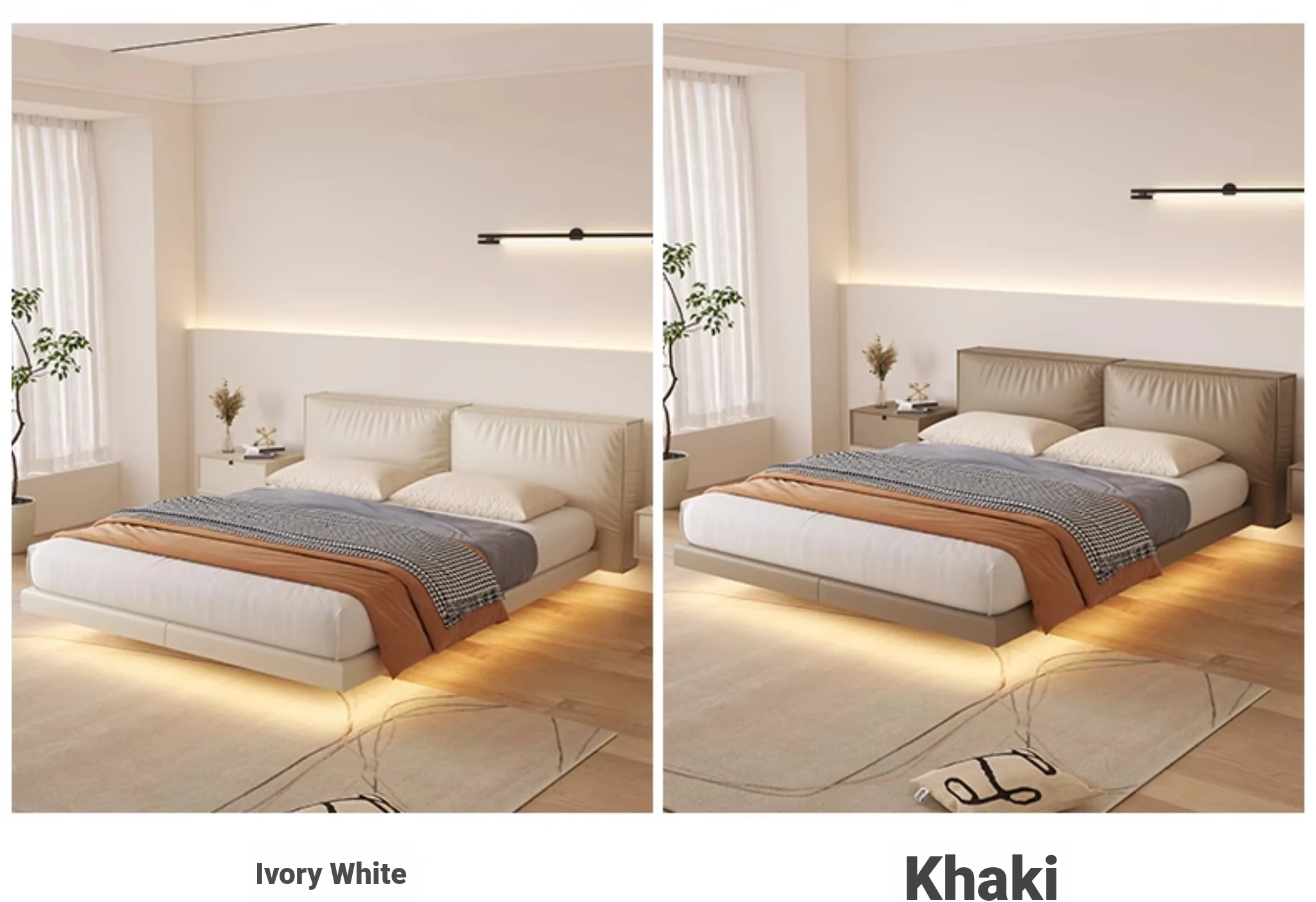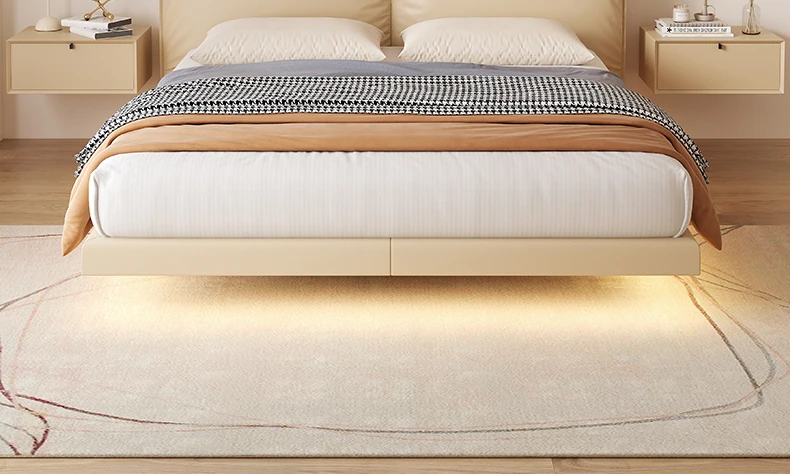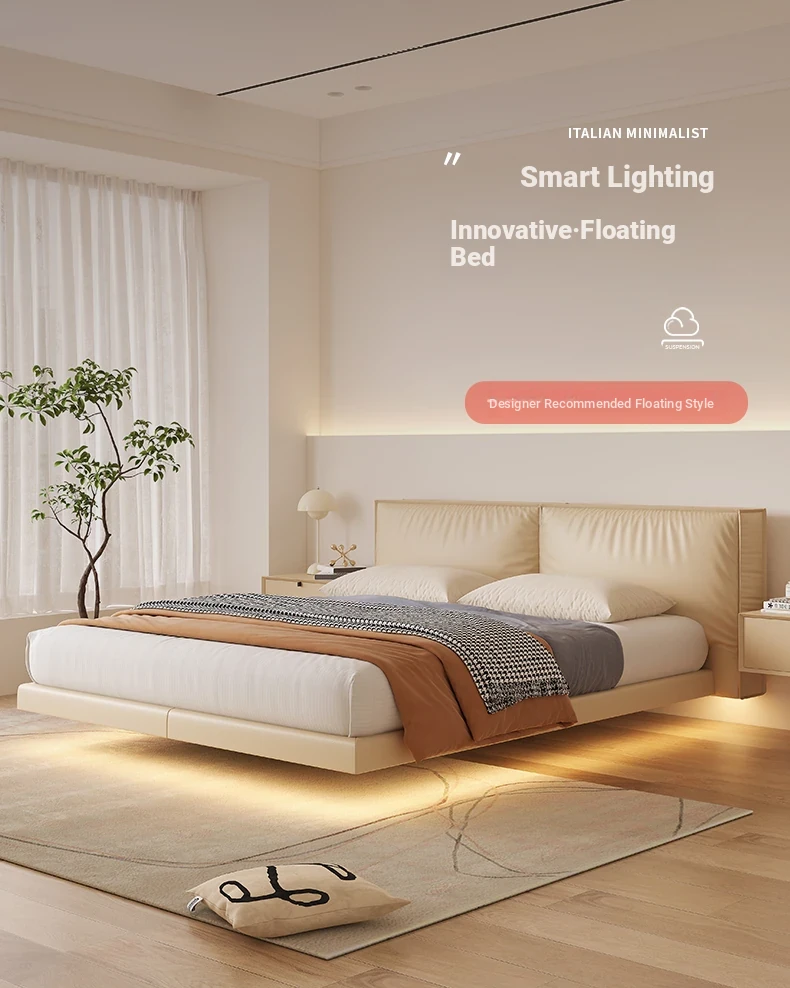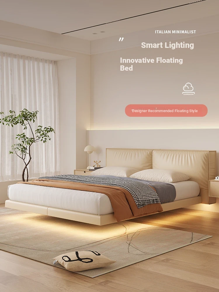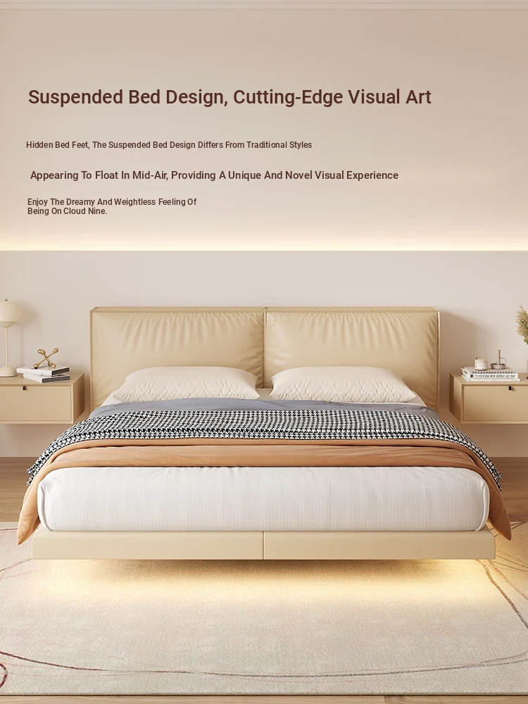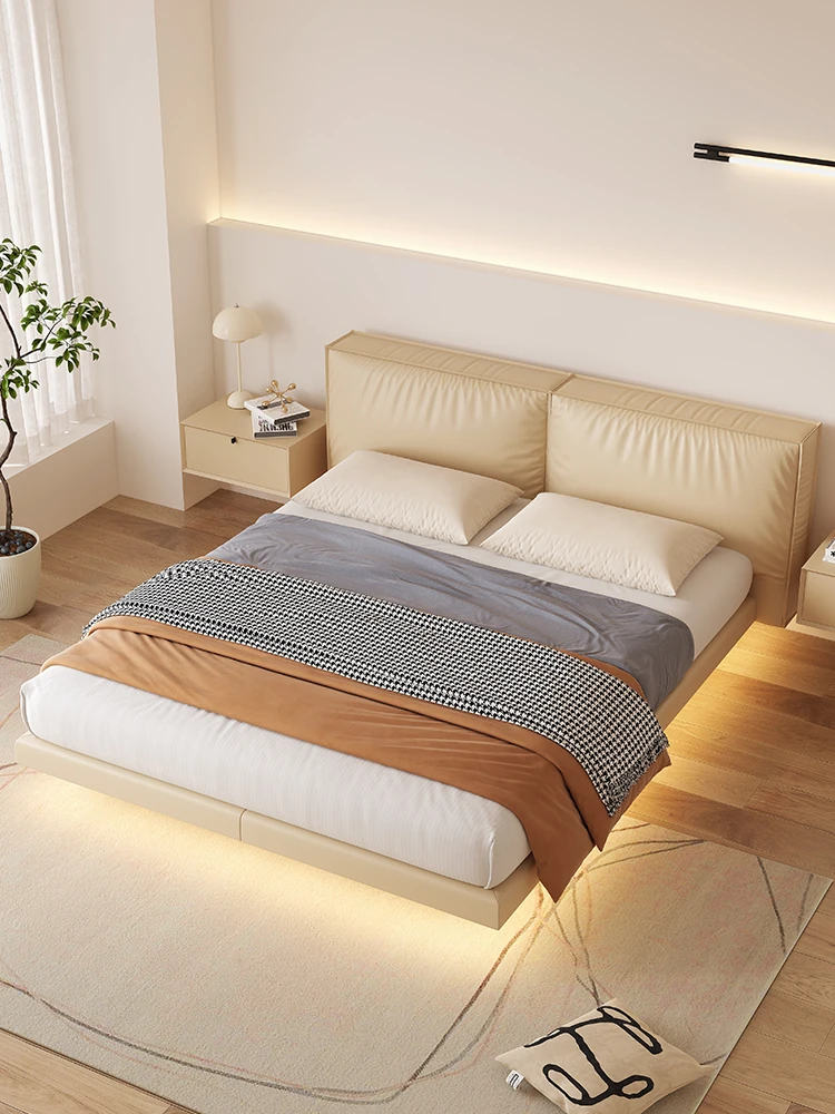 Italian Minimalist Floating Genuine Leather Bed with LED Sensor Lights – Luxurious Modern King-Size Soft Package Bed for Stylish Master Bedrooms