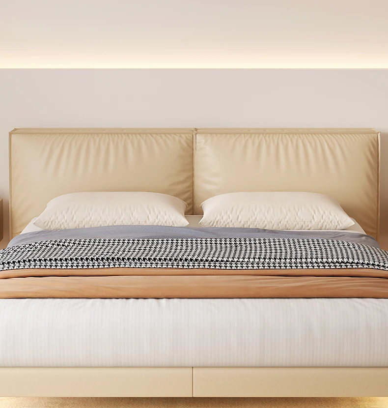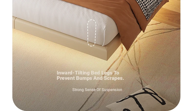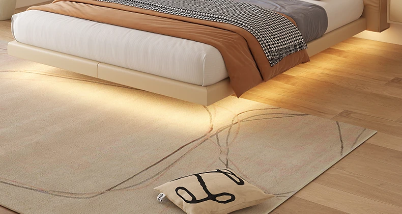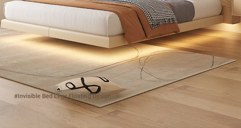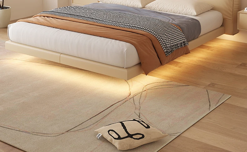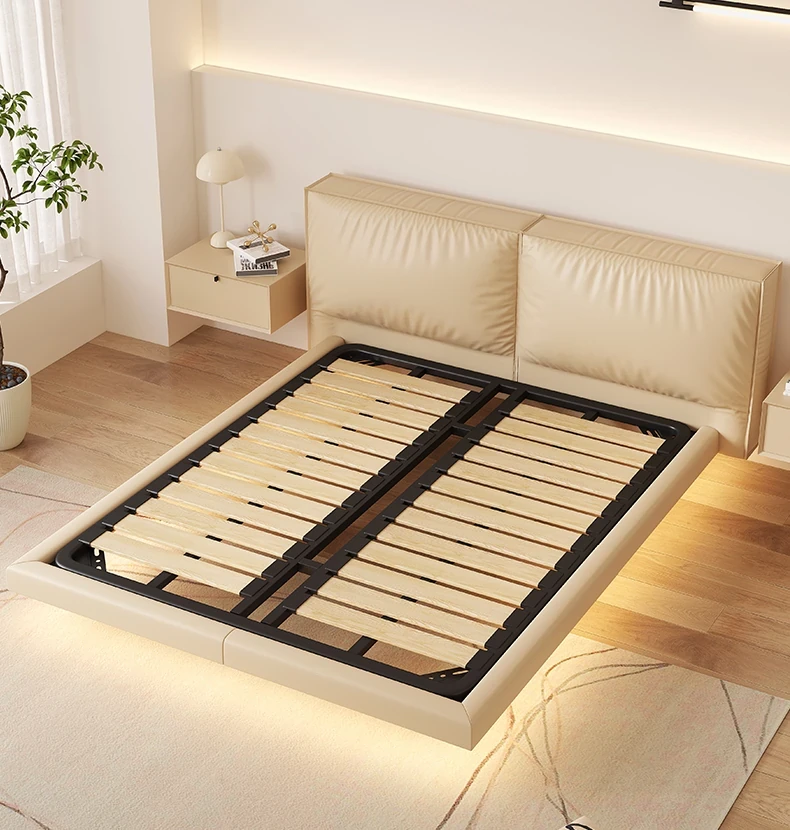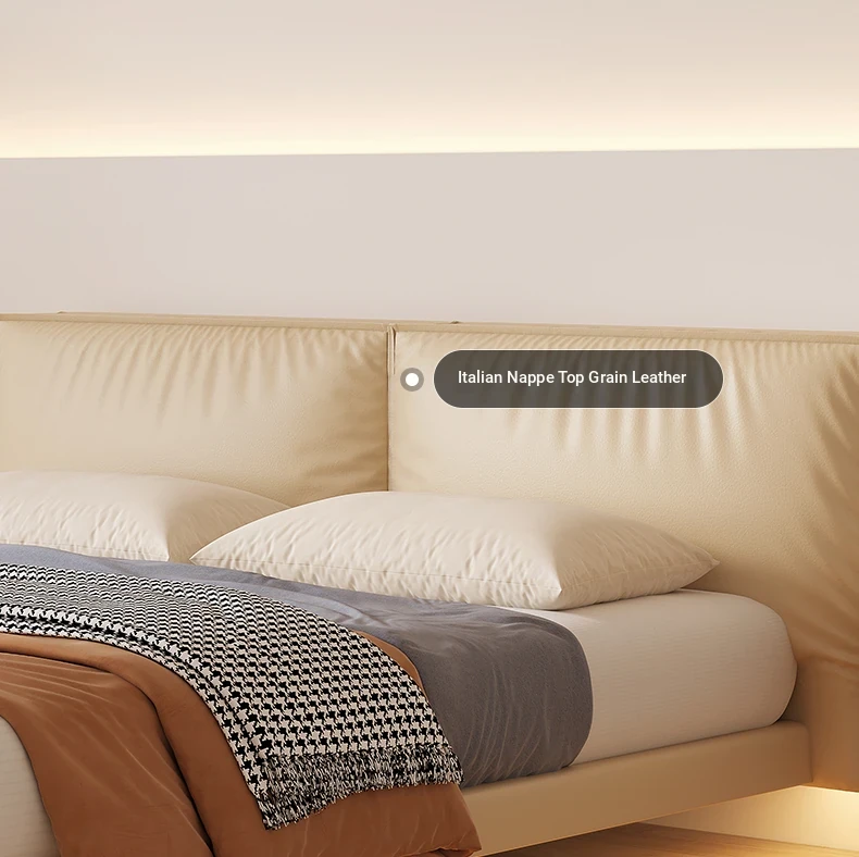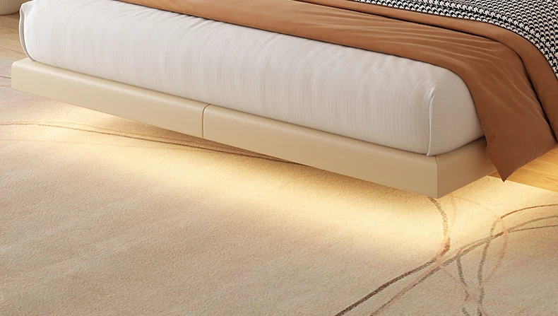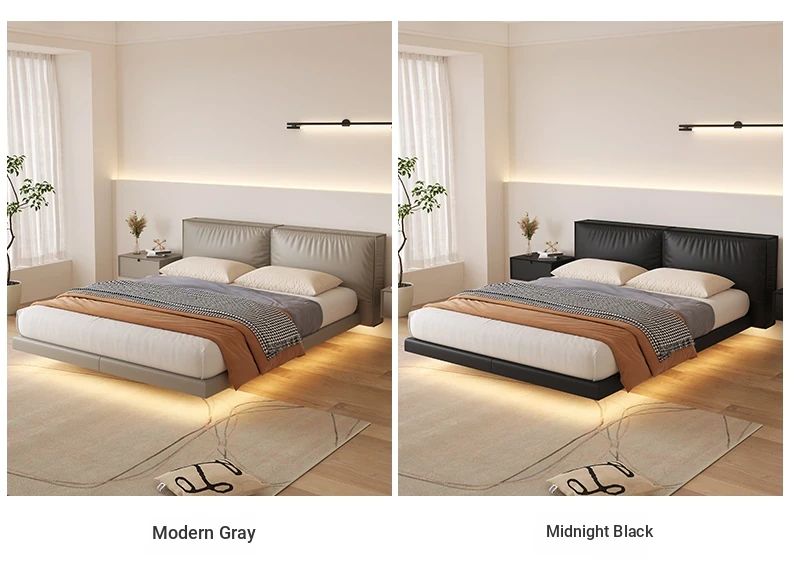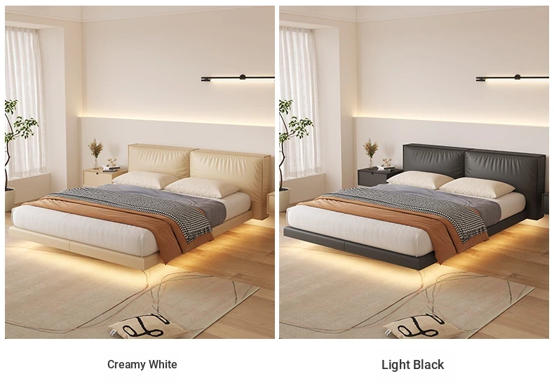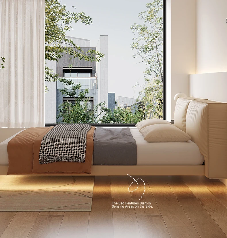 Italian Minimalist Floating Genuine Leather Bed with LED Sensor Lights – Luxurious Modern King-Size Soft Package Bed for Stylish Master Bedrooms