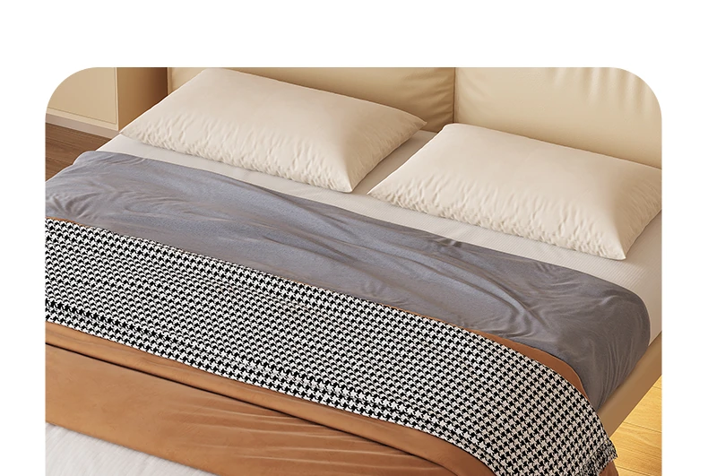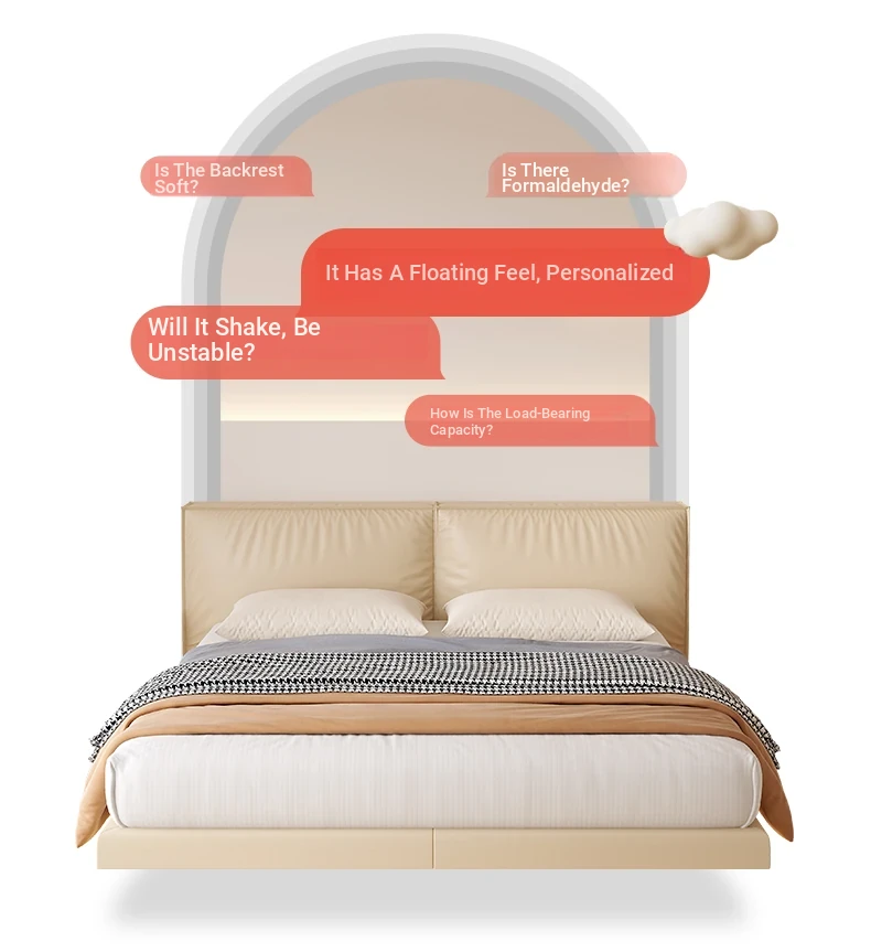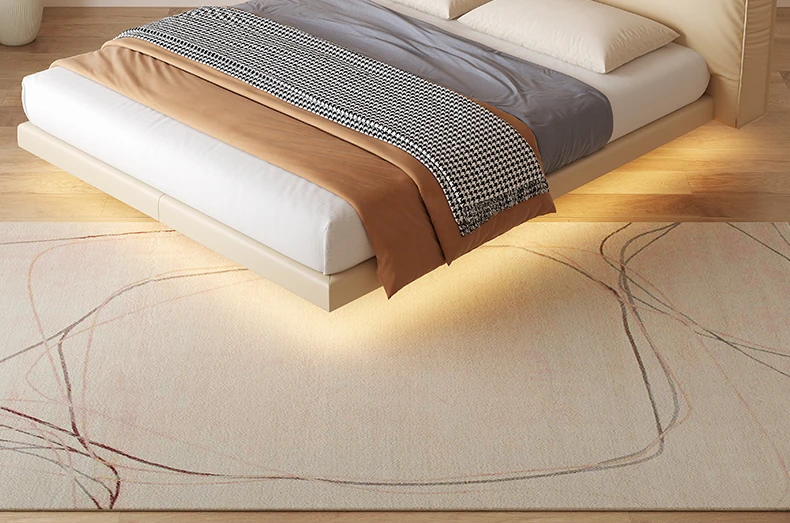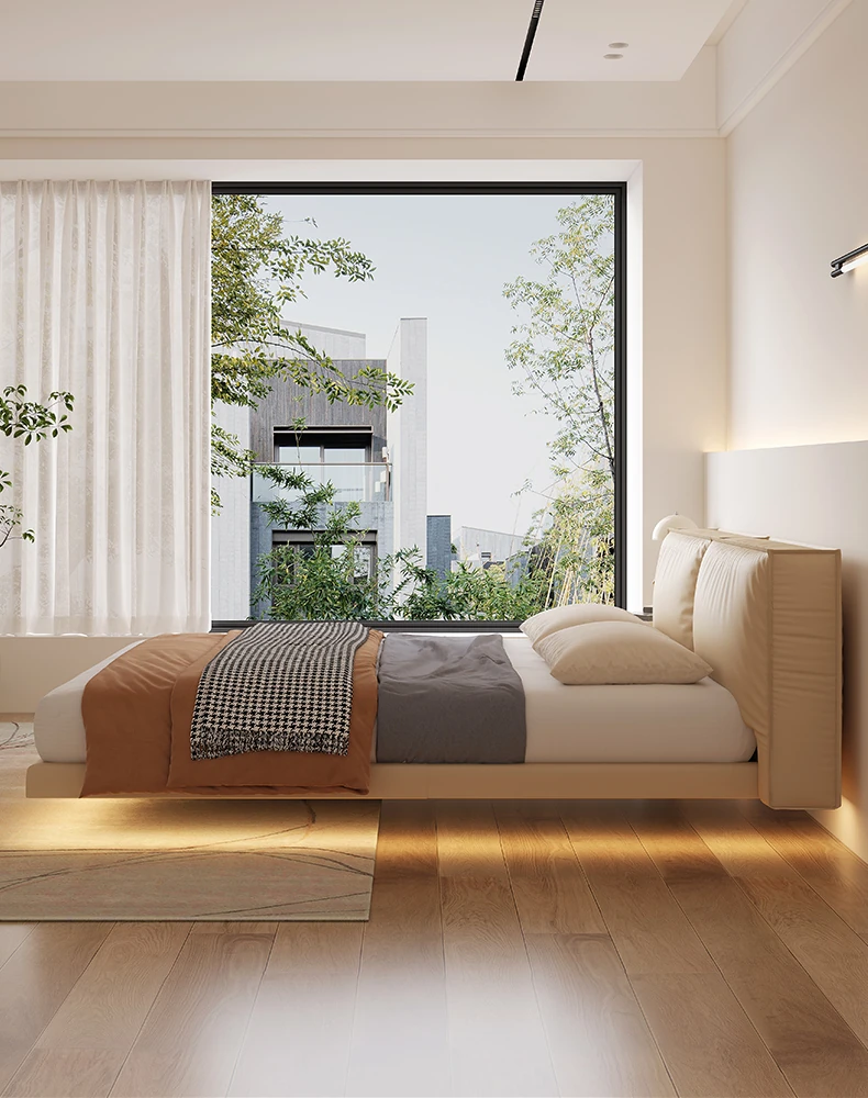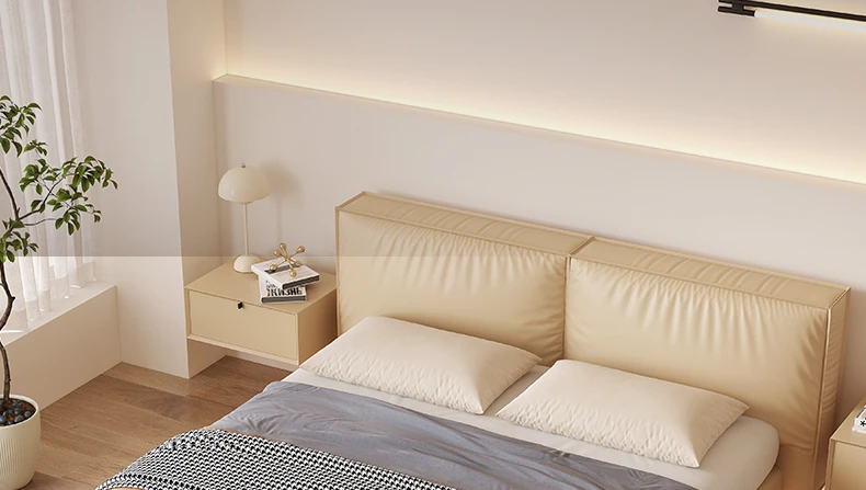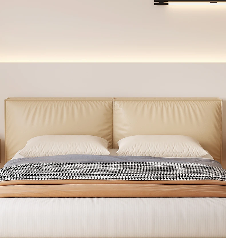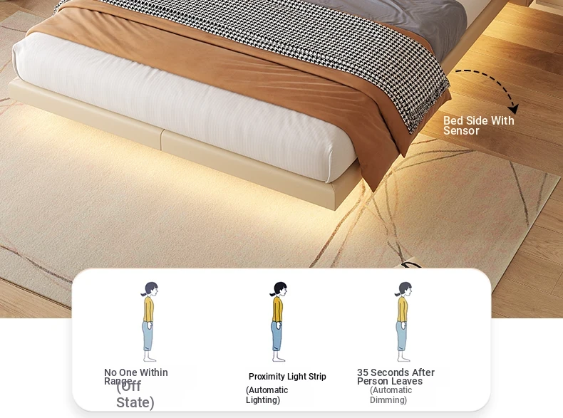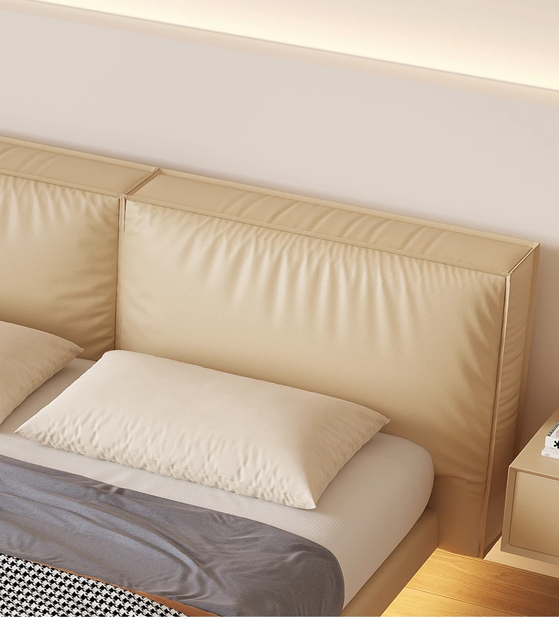 Italian Minimalist Floating Genuine Leather Bed with LED Sensor Lights – Luxurious Modern King-Size Soft Package Bed for Stylish Master Bedrooms